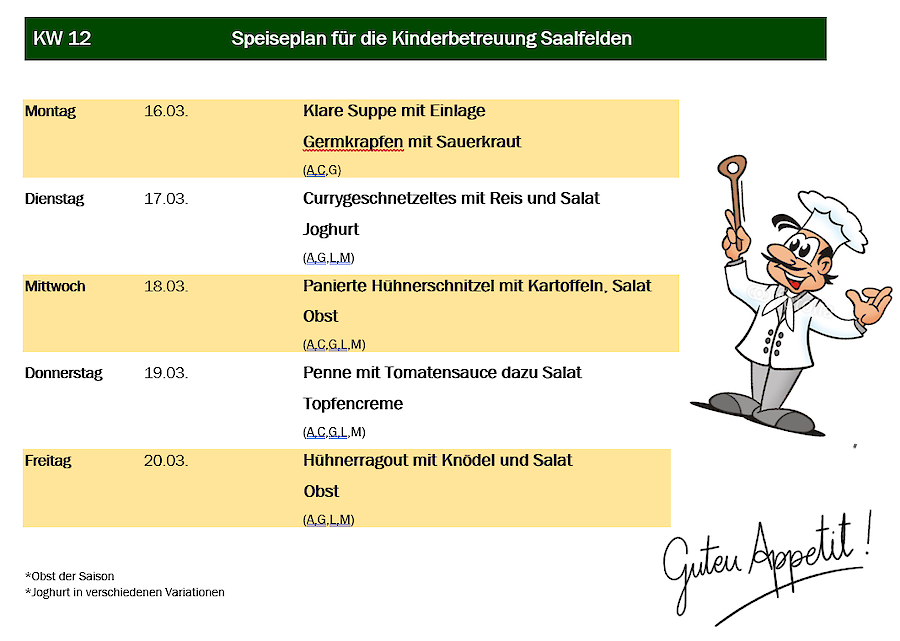 Aus organisatorischen Gründen muss das Essen immer am Mittwoch in der Vorwoche für die darauffolgende Woche in Ihrer Kindergartengruppe bestellt werden.