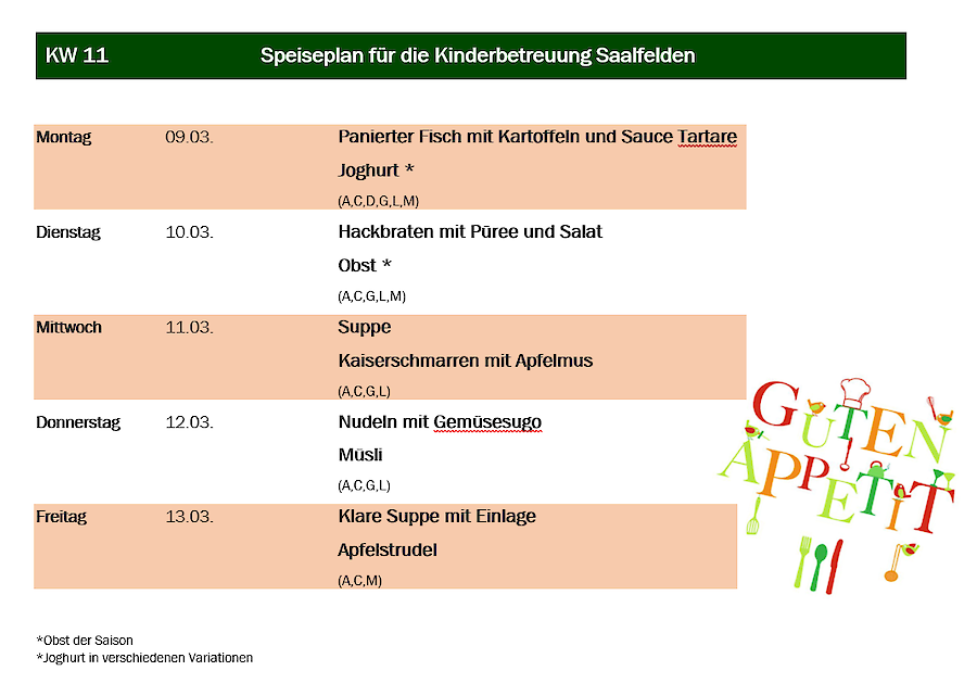 Aus organisatorischen Gründen muss das Essen immer am Mittwoch in der Vorwoche für die darauffolgende Woche in Ihrer Kindergartengruppe bestellt werden.