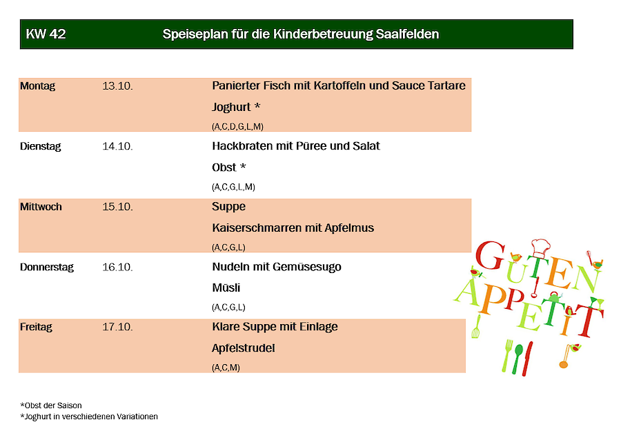 Aus organisatorischen Gründen muss das Essen immer am Mittwoch in der Vorwoche für die darauffolgende Woche in Ihrer Kindergartengruppe bestellt werden.