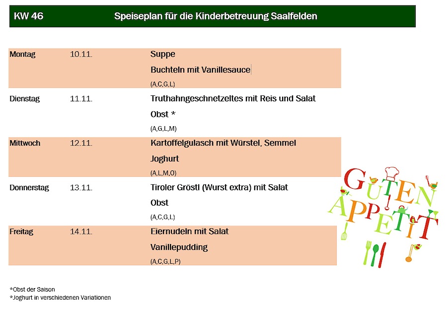 Aus organisatorischen Gründen muss das Essen immer am Mittwoch in der Vorwoche für die darauffolgende Woche in Ihrer Kindergartengruppe bestellt werden.