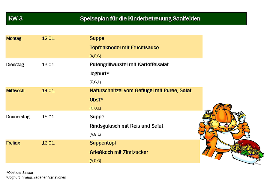 Aus organisatorischen Gründen muss das Essen immer am Mittwoch in der Vorwoche für die darauffolgende Woche in Ihrer Kindergartengruppe bestellt werden.