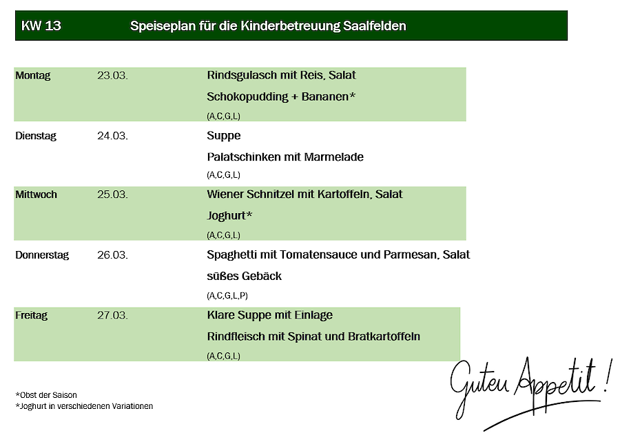 Aus organisatorischen Gründen muss das Essen immer am Mittwoch in der Vorwoche für die darauffolgende Woche in Ihrer Kindergartengruppe bestellt werden.