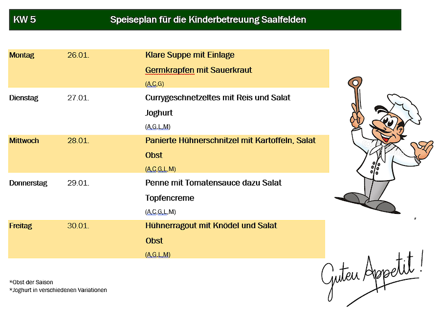 Aus organisatorischen Gründen muss das Essen immer am Mittwoch in der Vorwoche für die darauffolgende Woche in Ihrer Kindergartengruppe bestellt werden.
