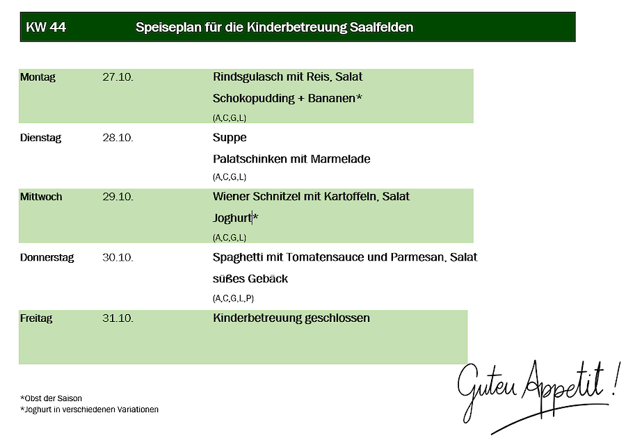 Aus organisatorischen Gründen muss das Essen immer am Mittwoch in der Vorwoche für die darauffolgende Woche in Ihrer Kindergartengruppe bestellt werden.