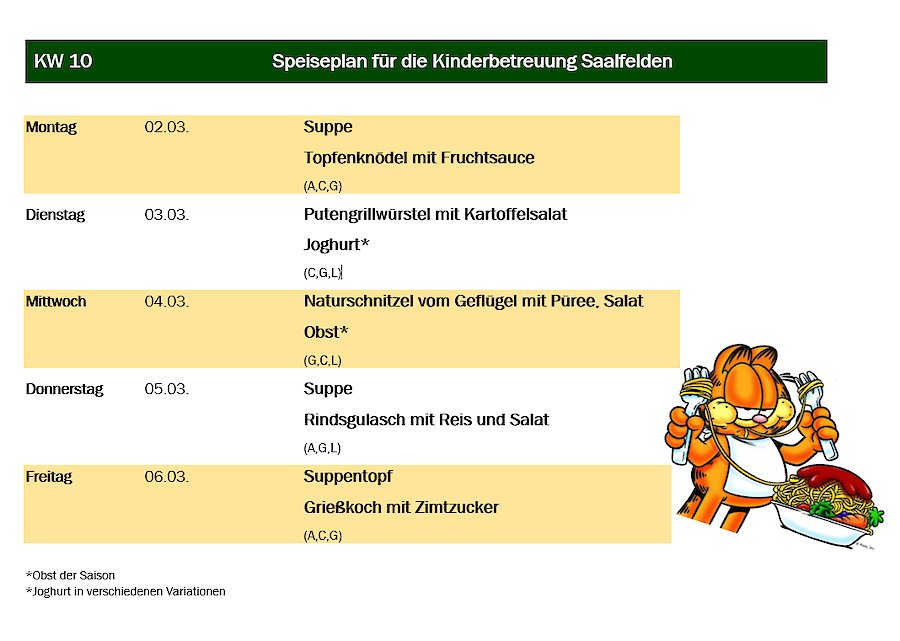 Aus organisatorischen Gründen muss das Essen immer am Mittwoch in der Vorwoche für die darauffolgende Woche in Ihrer Kindergartengruppe bestellt werden.