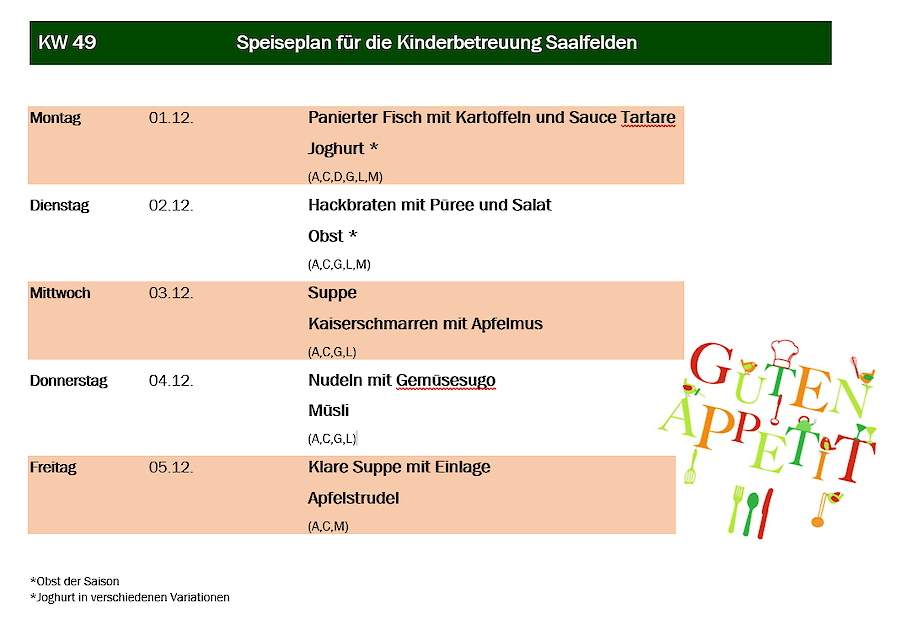 Aus organisatorischen Gründen muss das Essen immer am Mittwoch in der Vorwoche für die darauffolgende Woche in Ihrer Kindergartengruppe bestellt werden.
