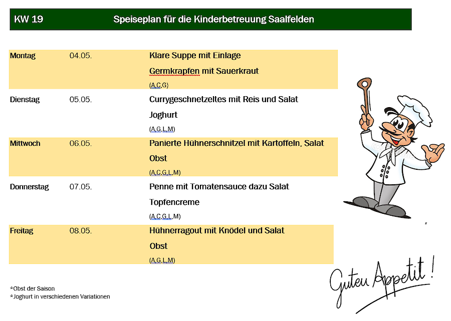 Aus organisatorischen Gründen muss das Essen immer am Mittwoch in der Vorwoche für die darauffolgende Woche in Ihrer Kindergartengruppe bestellt werden.