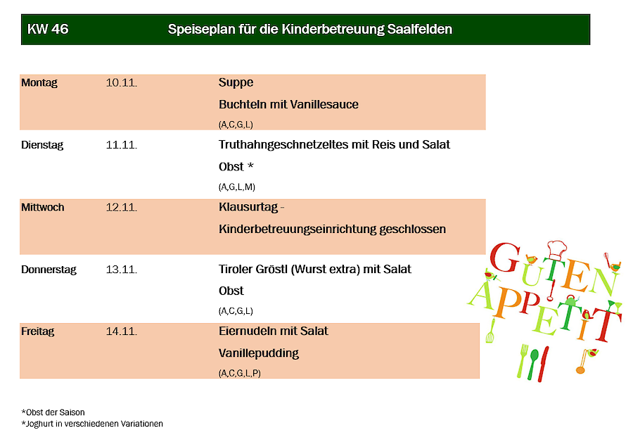 Aus organisatorischen Gründen muss das Essen immer am Mittwoch in der Vorwoche für die darauffolgende Woche in Ihrer Kindergartengruppe bestellt werden.